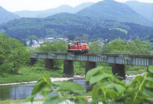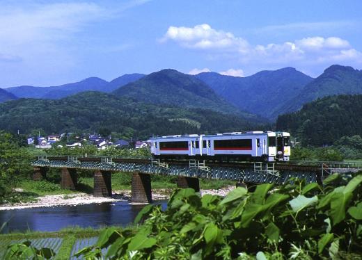 | 小国川・・・山形県内の陸羽東線に沿って流れ、舟形町で最上川に合流する川です。支流も含めてこの水系の川を同線は何度も渡っているのですが、この「第二小国川橋梁」の新庄(長沢)方は、特に撮影しやすいポイントにもなっています。 (東長沢〜長沢、2000年6月3日) |