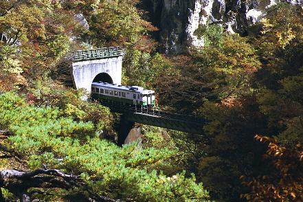 | 「鳴子トンネル」と「第一中山トンネル(?)」の間は、深い渓谷を渡る橋梁になっていますが、そこで一瞬だけ顔を出す列車を国道47号線の橋の歩道上から撮る、という有名なポイントです。 ・・・というわけなので、ほかにいくらでも優れた写真がこの場所では撮られているはずです・・・。 (鳴子温泉〜中山平温泉、1999年10月31日) |