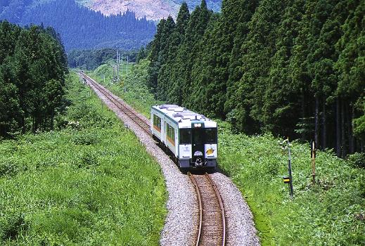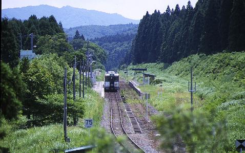 | 堺田駅の近くにある国道47号線の跨線橋上から。 ・・・もっといい撮り方があると思いつつ、このあと3年以上行っていません・・・。 (赤倉温泉〜堺田、2000年7月20日) |