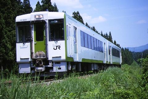 | 専用色ではないキハ110系も走ります。 (長沢〜南新庄、2000年6月3日) |